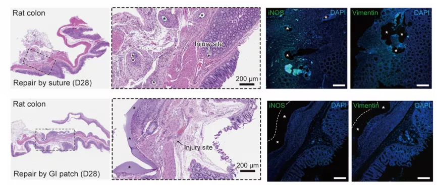 透過和梅奧中心合作,該團隊又建立了豬腸缺損模型,發現 28 天后所有的實驗豬都倖存下來,且該手術貼片仍密封損傷部位,組織切片及免疫熒光分析 a-平滑肌肌動蛋白 (a-SMA), I型膠原以及與炎症反應相關的 T 細胞(CD3)和巨噬細胞(CD68)等發現,腸道缺損完全癒合,周圍有纖維化組織,沒有肉芽腫或壁內膿腫形成的跡象,且沒有發現嚴重的炎症反應。