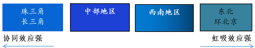 在那些經濟相對發達、產業結構也較為合理的地方,城市之間的“協同”效應比較強,城市群之間是共同發展、互相促進。而那些產業結構較為落後、整體市場前景不好的地方,就會產生資金、人才、技術等的“虹吸”效應,該地區的核心城市會快速地吸收周邊窮困地區的資金,從而推高核心地區的房價,然後人口外流和資金內逃的結果則是降低周邊小城市的房價。具有虹吸效應的城市,最典型的就是北京,北京周邊是京津冀地區大片的貧困帶,但唯有北京這一個城市就是該區域唯一的超一線城市。