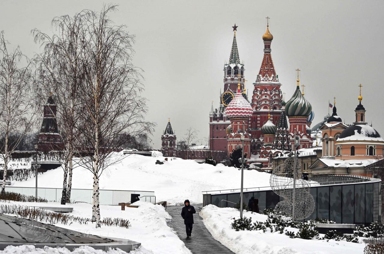 2月3日,一名男子在俄羅斯莫斯科克裡姆林宮斯帕斯克塔樓和聖瓦西里教堂前行走。 新華社/法新