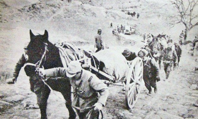 此時,在緊張危急的戰況下,有兩匹騾子一頭驢穿過後方來到游擊隊的陣地前,在它們身後拉著的,正是我軍的秘密武器。