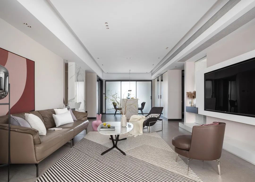 客廳簡潔的無主燈頂面加上淺灰啞光地磚,整個空間雅緻淡定從容。隨性而不隨意擺放的傢俱散落客廳各處,低飽和度的色彩放鬆身心,洗去疲憊,將溫暖進行到底。