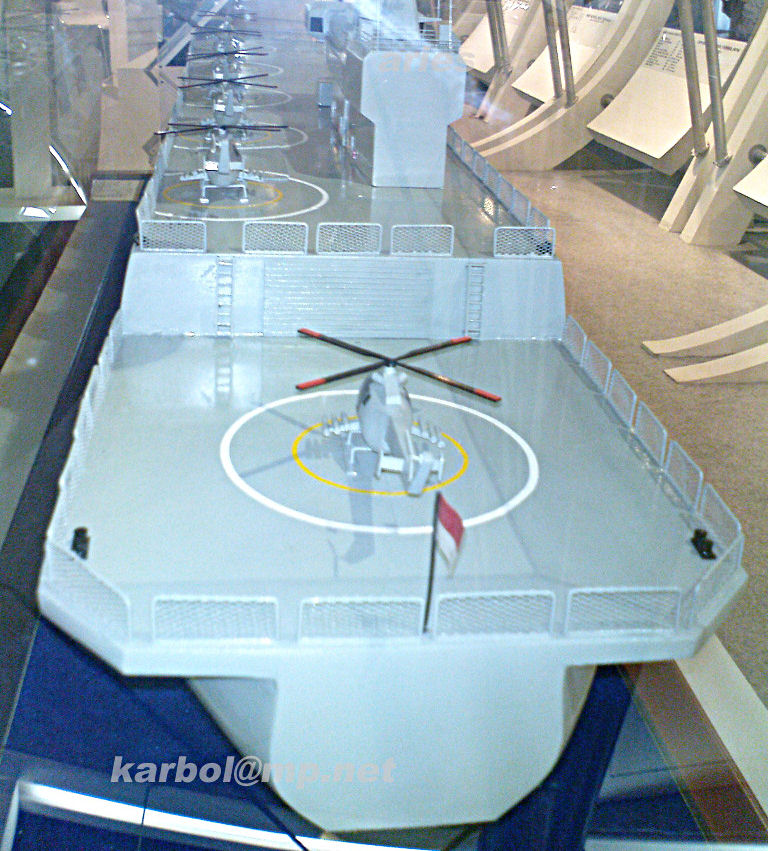 更有意思的是,從資料上看,印尼新LPH有兩個方案,一個有6個直升機起降點,另一個則有8個,堪稱加長版“悍馬”。而它的展板上,則寫著長190米,滿載排水量35000噸,可搭載16架直升機。而加長版的艦長更是達到了244米,那它的排水量豈不接近50000噸了?看來印尼的野心不小。