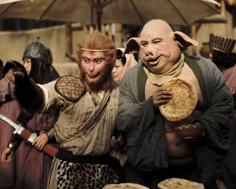 這是什麼劣質頭套?人家猴子是尖嘴猴腮,誰說是尖耳朵啊,這明顯就不還原,亂改編,孫悟空都像妖怪了還美猴王,還有豬八戒,過分臃腫肥膩的豬腦袋,滷菜都沒人吃。