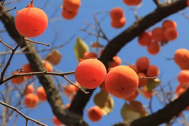 卵圓形的葉子,像著急做什麼似的,匆忙換上霞裳,先於柿子而落,只剩橘黃色的柿子掛滿枝頭。
