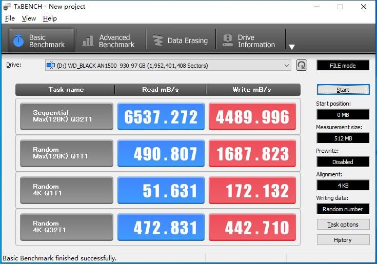 在CrystalDiskMark的測試中,WD_BLACKAN1500在不同的佔用情況下均達到並且超越了標稱值,最高順序讀寫速度達到了6848.42MB/s,最高順序寫入速度達到了4213.95MB/s,並且透過“fsutil file createnew”命令快速生成大體積測試檔案,使磁碟剩餘空間佔用超過90%時,成績也與空盤差距不大。超越標稱資料的表現,讓人對這款產品也更加放心。