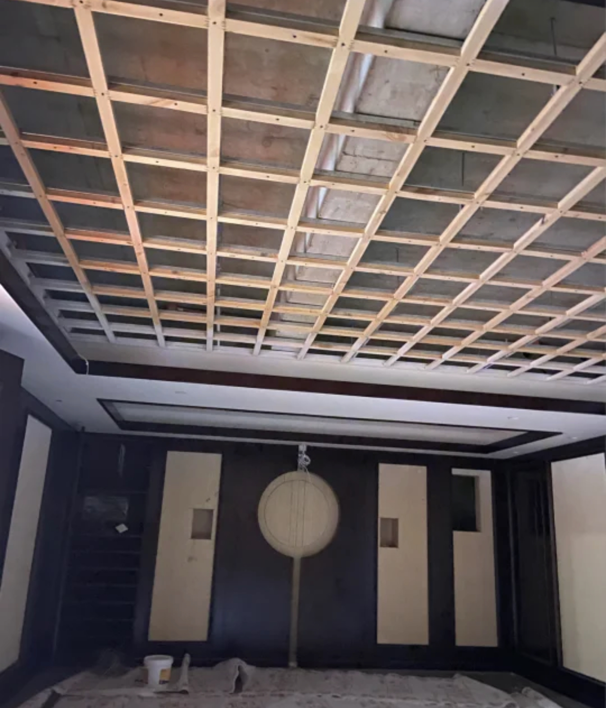 上面這一位網友,就踩了吊頂施工的坑。明明裝修合同裡寫著用輕鋼龍骨做骨架,結果到現場一看,木工直接給用的是木質龍骨。雖然木龍骨安裝簡單、還能做複雜造型,但是它既不防潮也不防水,還容易變形,另外穩固性不高。所以現如今的吊頂基本都是用鍍鋅鋼板的輕鋼龍骨做骨架,另外在輕鋼龍骨下面安裝上木龍骨用來做造型。