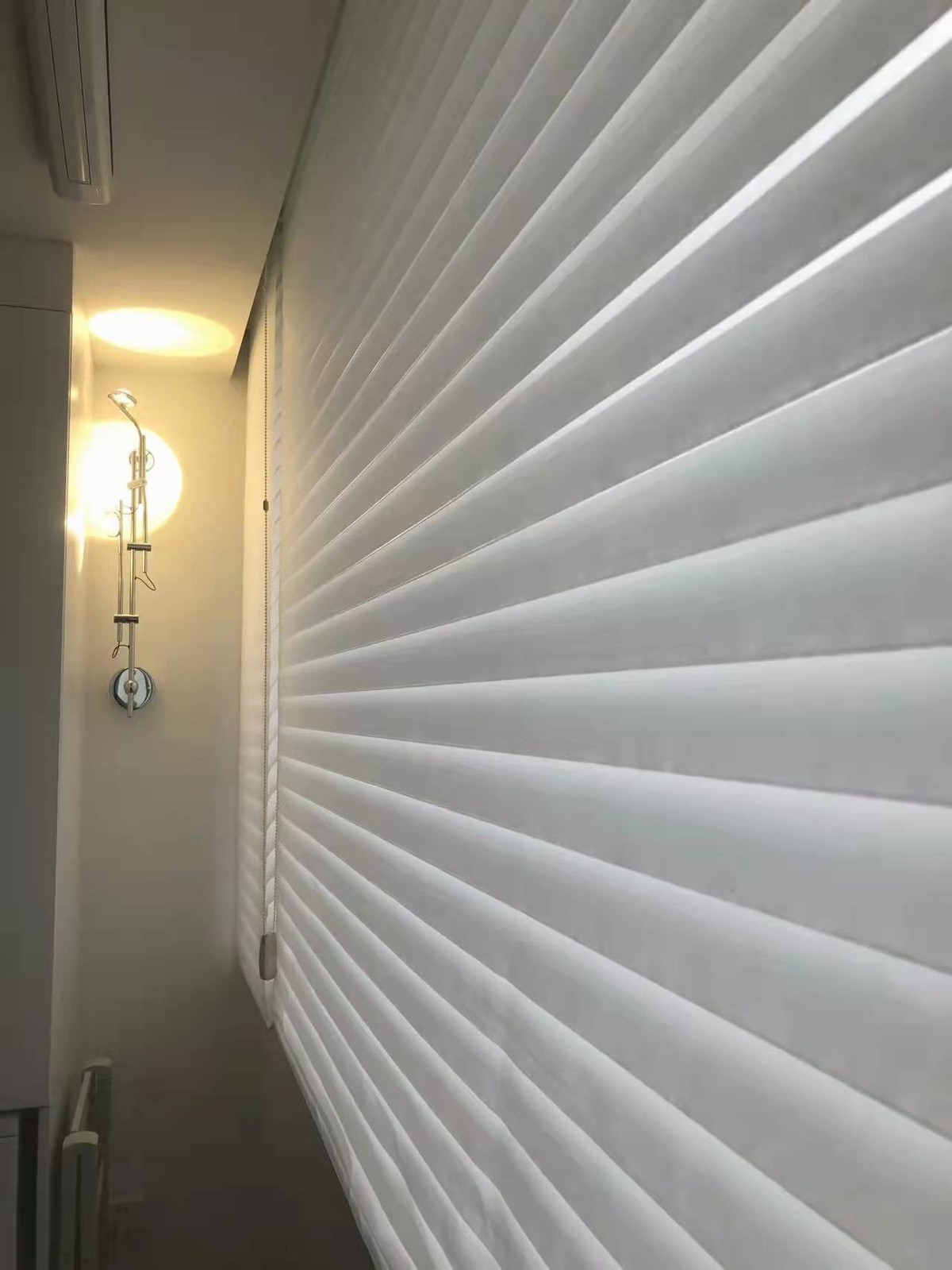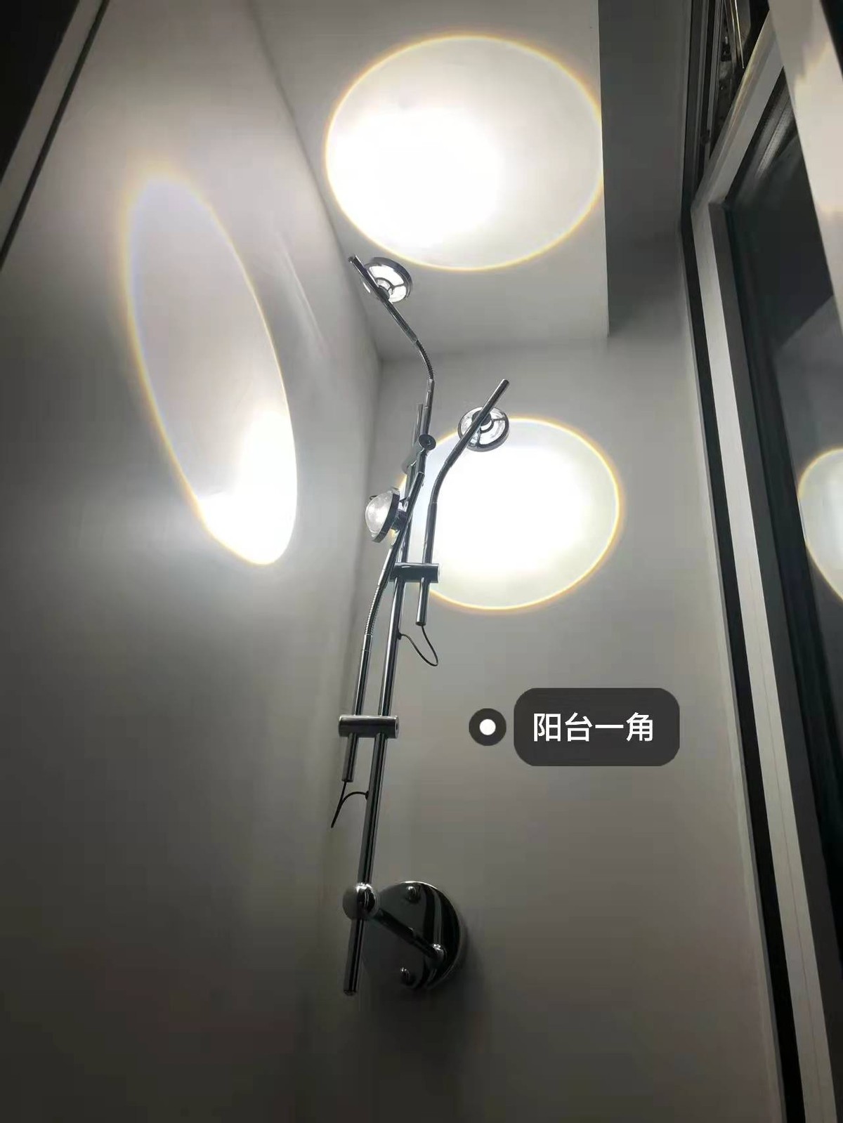 陽臺裝了一個壁燈和一個LED條形燈,風格都很簡約。