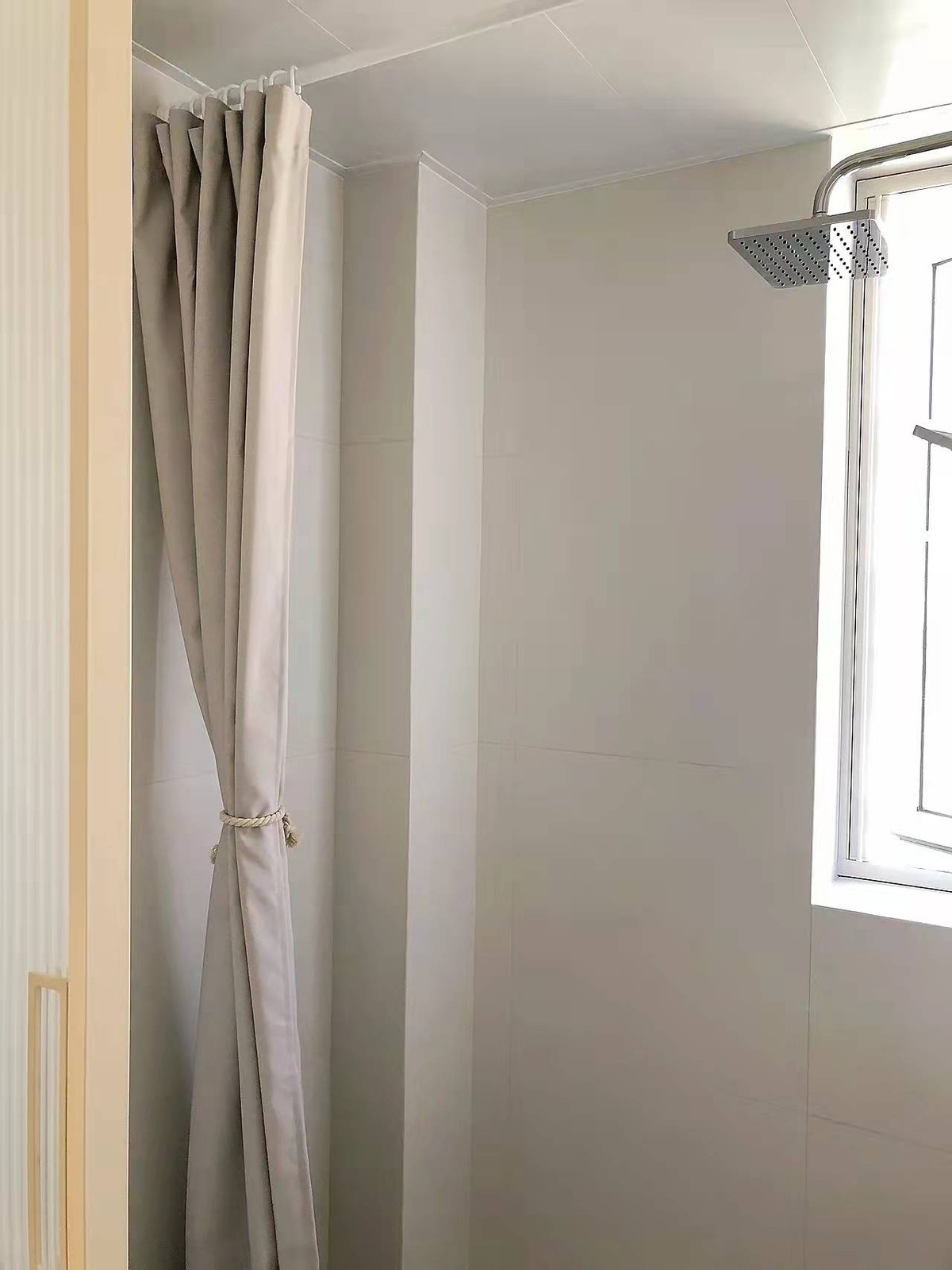 小薇不太喜歡塑膠感的浴簾,給浴室裝上了一張有質感的布簾。