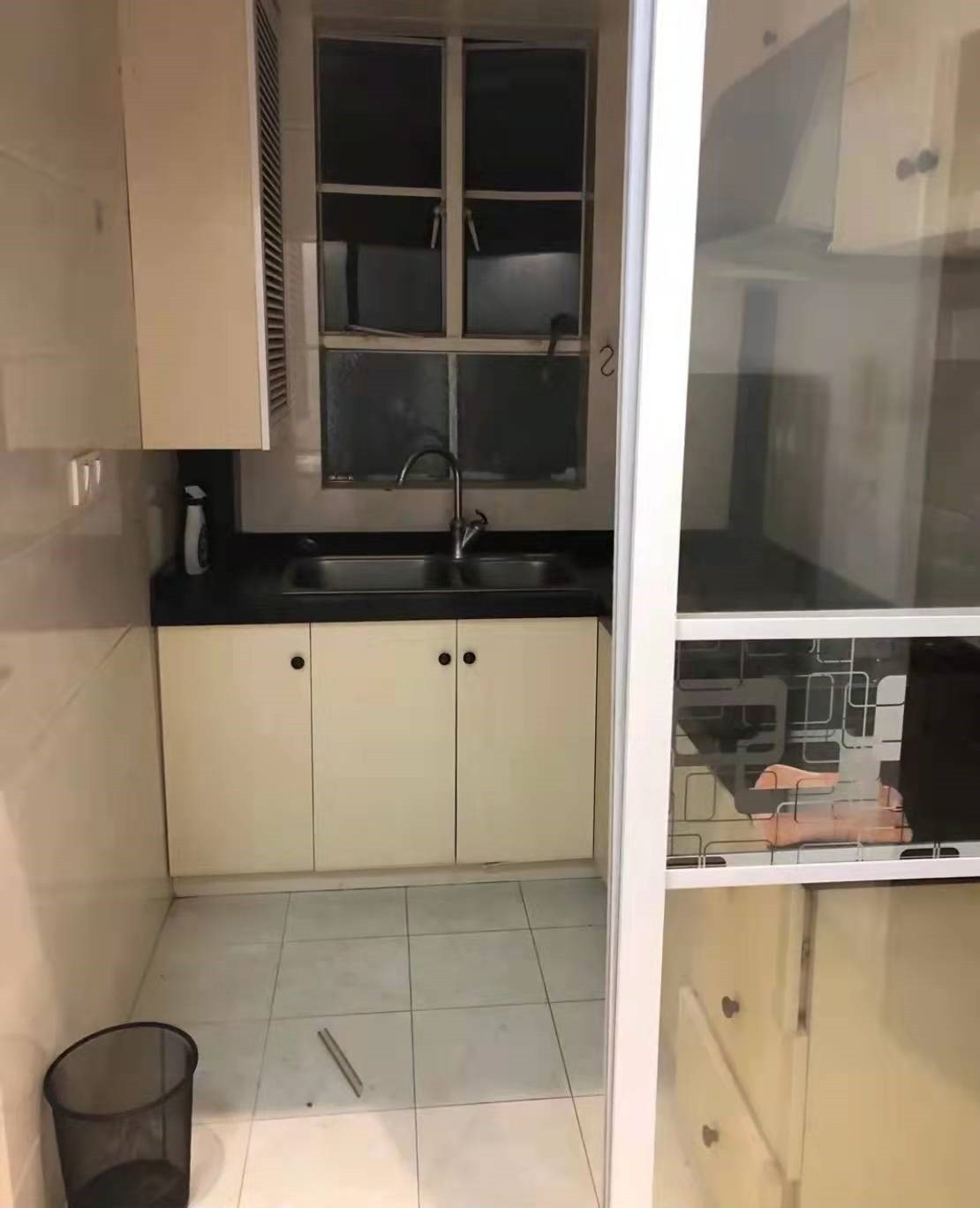 考慮到地上容易髒,地面瓷磚選的是低飽和度淺黃帶細閃瓷磚,比柔光磚更光滑易打理。