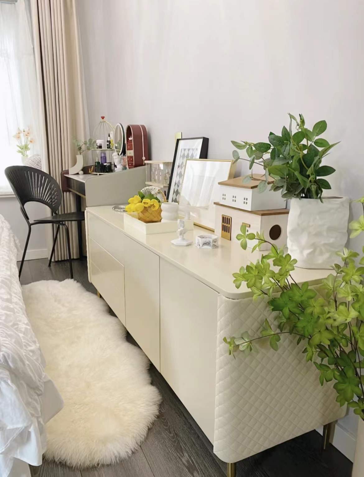 靠牆放了一個長的儲物櫃,收納空間增加很多,顏色奶黃奶黃的,又增加了幾分柔和。