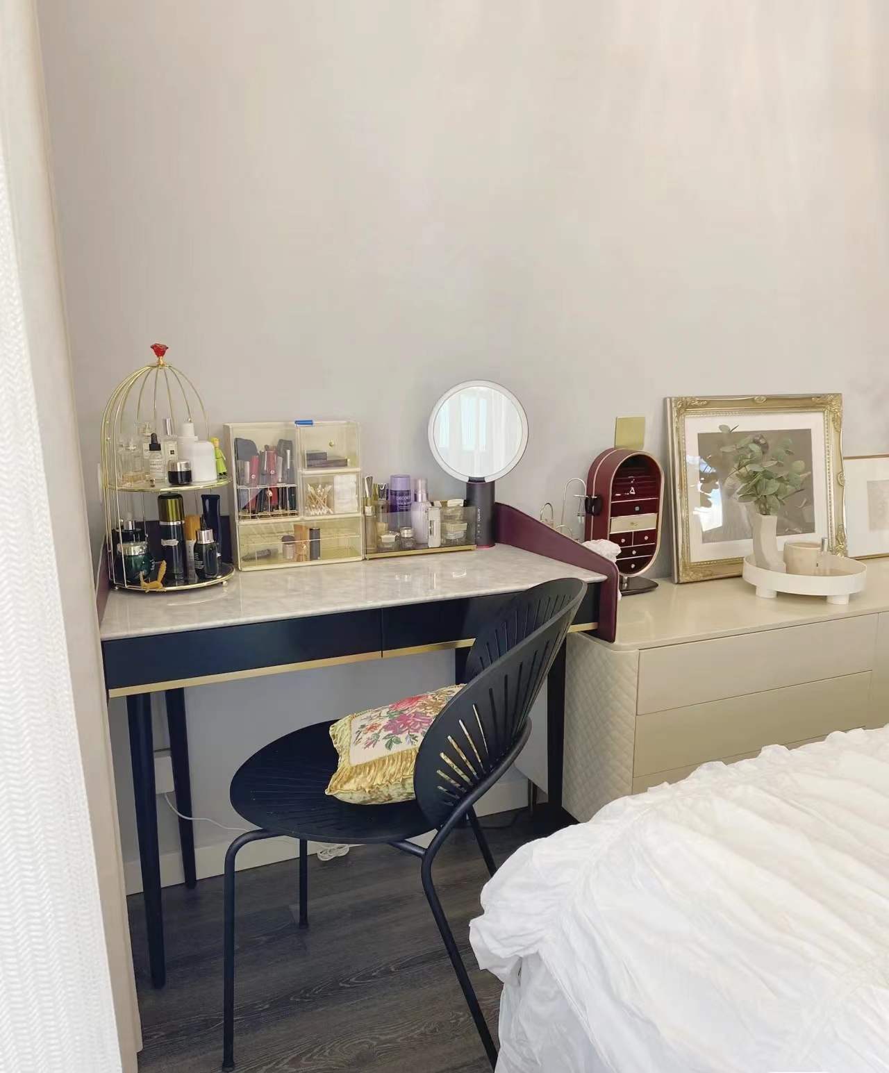 一旁放置了梳妝桌,檯面使用了各種樣式的收納,讓檯面整潔有序。