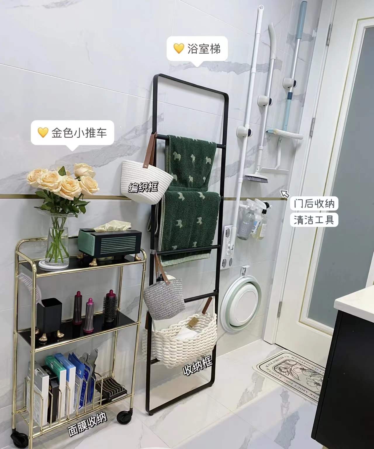 家裡的置物架基本都是黑色或者搭一點金屬元素,很喜歡顏色統一的感覺,一眼看過去特別整齊,能上牆的全部上牆,門後收納清潔工具,控與牆面靠浴室梯放浴巾類,每次進浴室都是慢慢的幸福感。