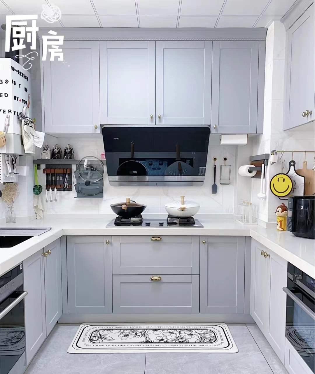 櫥櫃收納:調料抽收納醬料瓶等,上下兩層拿取方便,灶具下面是碗籃和鍋具籃,上層附帶小抽屜收納筷子、勺子等;