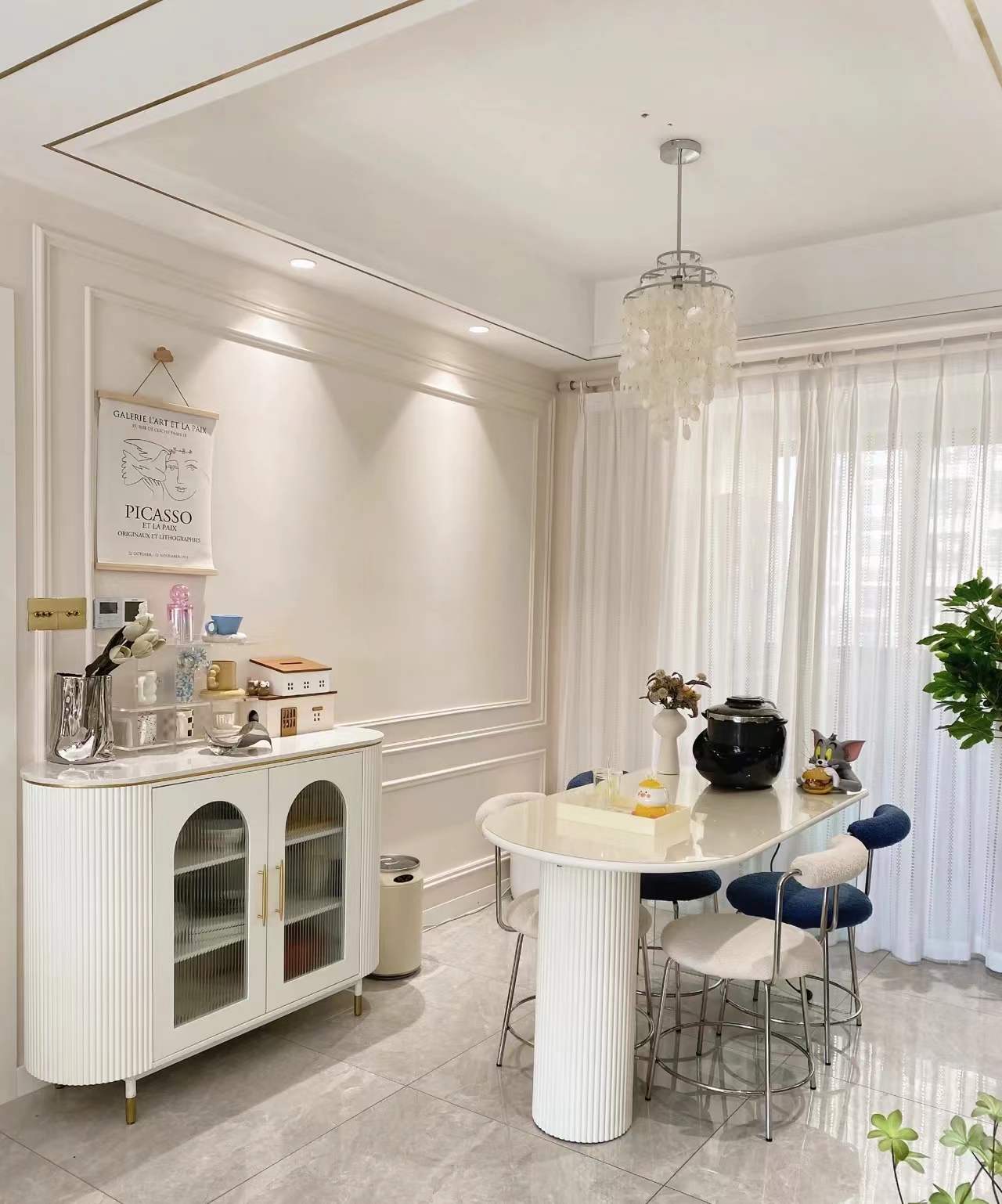 因為客餐廳是一體的,也延續了客廳的風格,奶白色的餐邊櫃和餐桌,整體特別溫柔,淺色系也不難打理,反而很好打掃,餐椅選擇了跳色的藍和白色,整體顯得不單調。