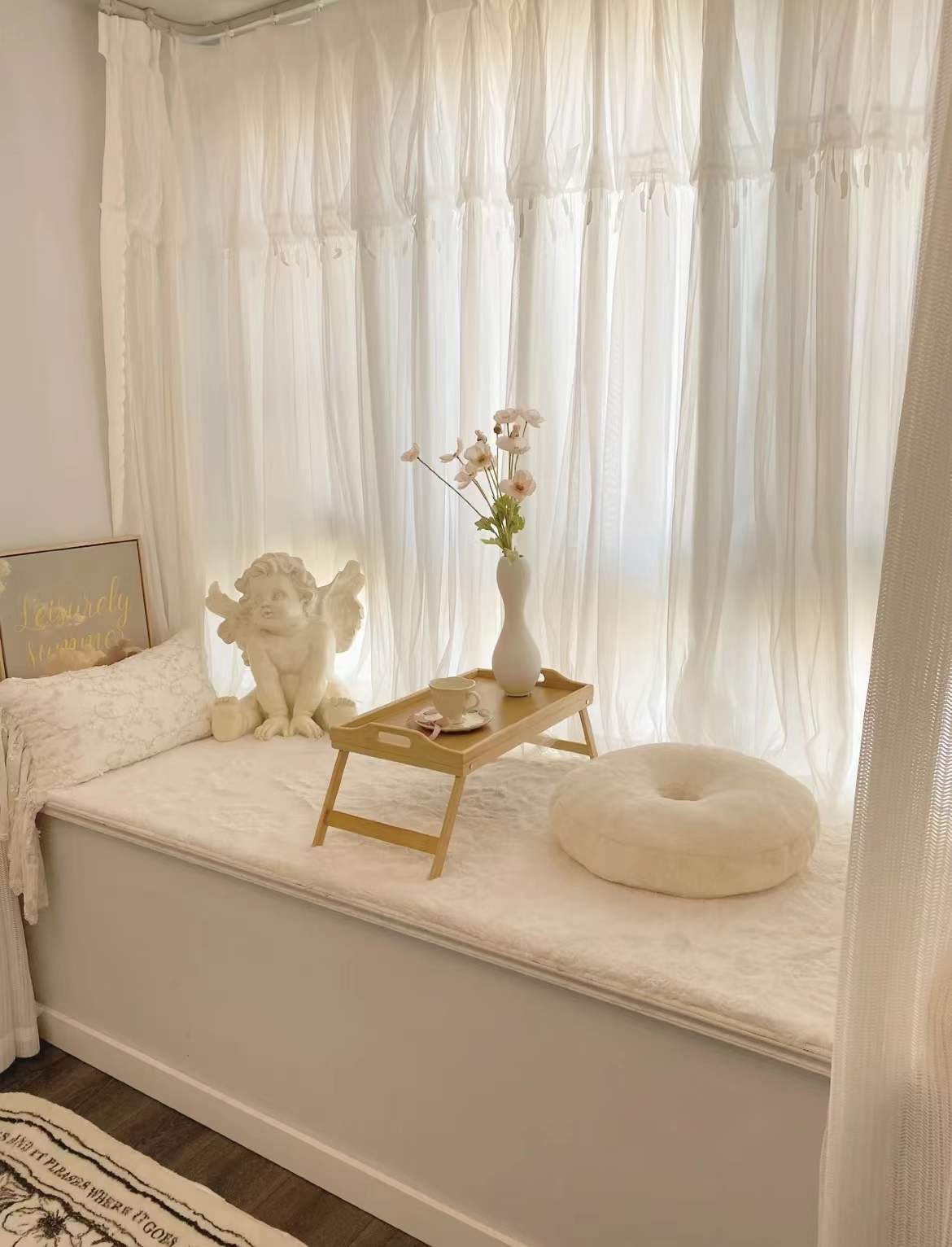 飄窗沒打掉,直接打造了一個休閒區域,掛上少女心十足的紗簾,毛茸茸的飄窗墊,中間放一個小桌子,氛圍感馬上就出來啦,平時在上面休息曬太陽,超級舒服又愜意;
