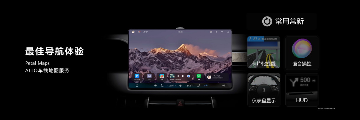 HarmonyOS智慧座艙能夠實現與人、手機、智慧家居、智慧手錶等進行無縫流轉。使用者還可透過手錶進行車況查詢、遠端控車、無感解鎖以及手錶尋車,HUAWEI WATCH 3系列將率先支援此功能。該車還配備了HUAWEI SOUND音響系統、由華為Petal Maps提供的全新車載地圖服務;車內還配備66W有線快充和40W無線快充。
