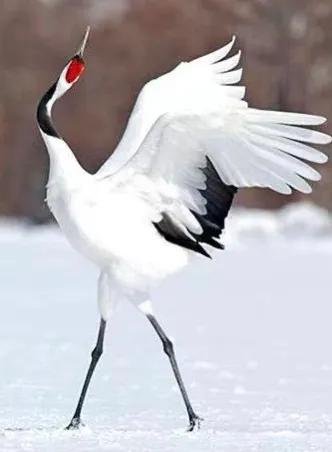 丹頂鶴,全身披著純白的羽毛,只有長長的脖子、豐翼的羽尾及細細高高的腿腳染著黑色,最引人注目的是頭部紅色的丹頂。詩人讚譽:“丹砂作頂耀朝日,白玉為羽明衣裳”。