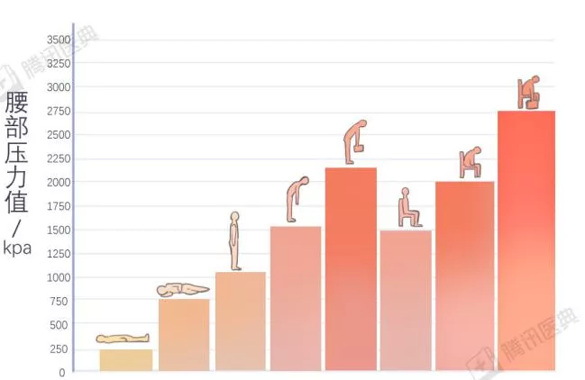 看下面這張圖,在不同的姿勢下,腰椎間盤承受的壓力(縱軸)差別很大。