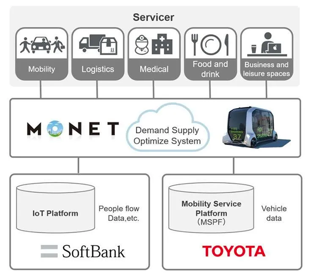 這一思路其實早就有。2018年,軟銀和豐田共同出資100億日元(約合5億人民幣),成立合資公司“Monet”。Monet的任務是實現自動駕駛和出行服務的結合,其技術資產是軟銀資料分析平臺“IoT Platform”,以及豐田資訊平臺MSPF。