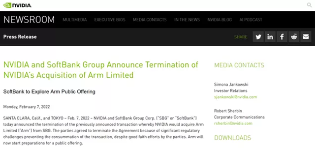 2月9日,英偉達釋出公告,宣佈終止對半導體智慧財產權提供商ARM的收購。作為出售方的軟銀將獲得12.5億美元的補償,但這筆錢遠遠彌補不了預定盈利400億美元的損失。