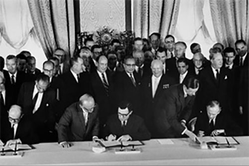 由美國、蘇聯、英國三大巨頭組織,63個國家參與的盛事:簽訂《禁止在海底試驗核武器條約》即禁止在海床洋底及其底土安置核武器和其他大規模殺傷性武器條約。