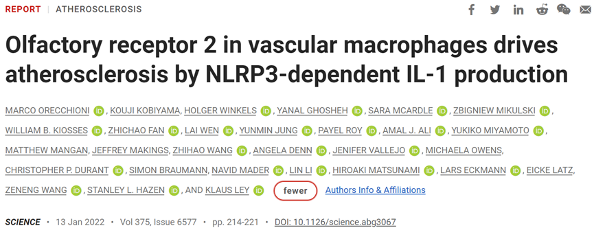來自美國拉霍亞免疫學研究所的Klaus Ley和他的同事們發現,人類動脈中的巨噬細胞表面存在嗅覺受體OR6A2,能夠與一種稱為辛醛(octanal)的帶氣味分子發生互作,引發由NLRP3介導的炎症反應,驅動動脈粥樣硬化的進展[1]。
