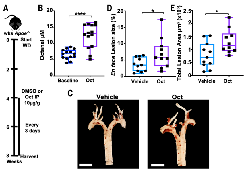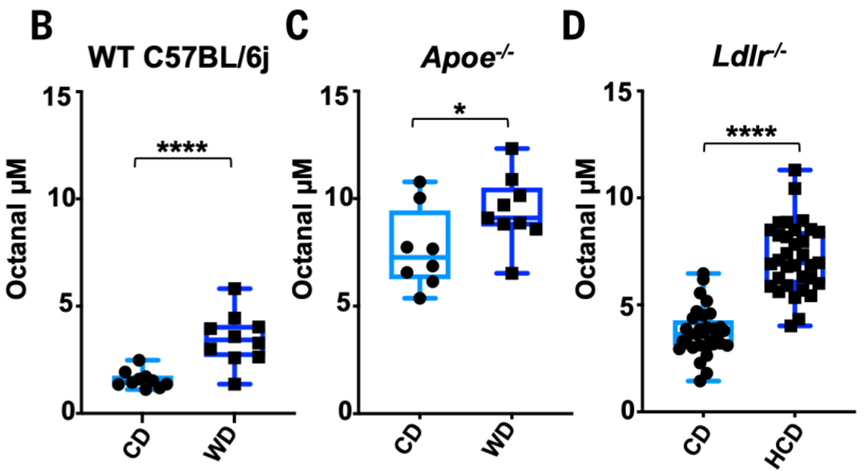 當給野生型小鼠(C57BL/6)分別進行正常飲食(鼠糧)和高脂飲食(42%熱量來自脂肪)餵養後,前者血液中的辛醛水平略微降低,而後者的辛醛水平提升近一倍。相似的結果也可在動脈粥樣硬化小鼠(Apoe−/−、Ldlr−/−)中觀察到。