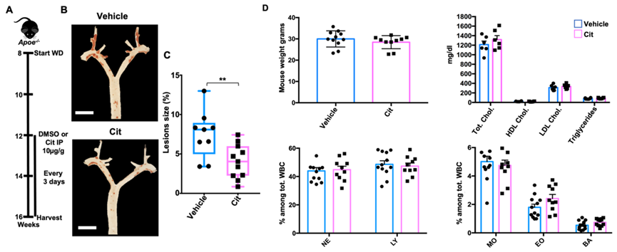 他們找來了小鼠巨噬細胞上OLFR2的抑制劑——檸檬醛,一種聞起來是檸檬味兒的化合物[6]。在給動脈粥樣硬化小鼠(Apoe−/−)注射檸檬醛(10μg/g)、抑制OLFR2的活性後,研究者們發現,16周後小鼠的炎症減輕了,動脈粥樣硬化病情緩解約40%,且小鼠的體重、白細胞水平等都沒有受到影響。
