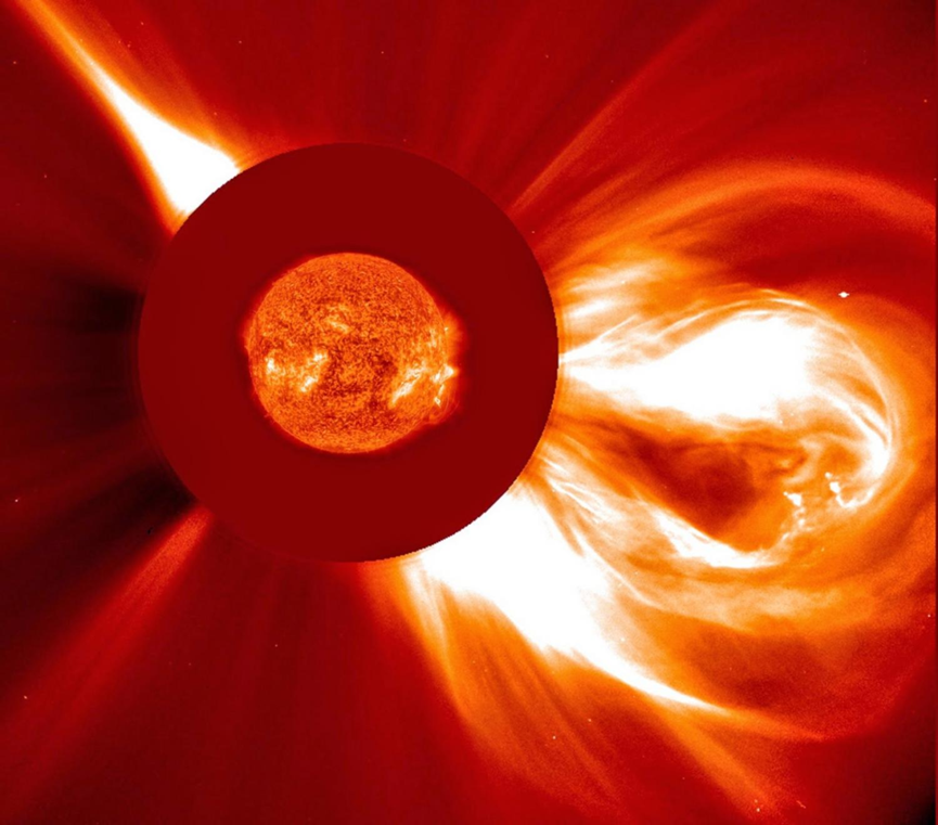 比如下面這幅日冕物質拋射,羽狀丟擲的物質是由SOHO太陽探測器的LASCO光譜儀拍攝的,但LASCO從來只敢遮著太陽觀察日冕。因為假如它在無遮擋的情況下直接“看”一眼太陽,那就是最後一眼——裝置會當場燒壞。而下圖中間的太陽,是由探測器上的EIT望遠鏡在極紫外波段拍到的,比起正常尺寸放大了些,填到中間,以增強圖片效果。這兩臺儀器,一個不敢看太陽,一個看不到外層日冕,各自拍一部分,拼到一起,就還挺美的。