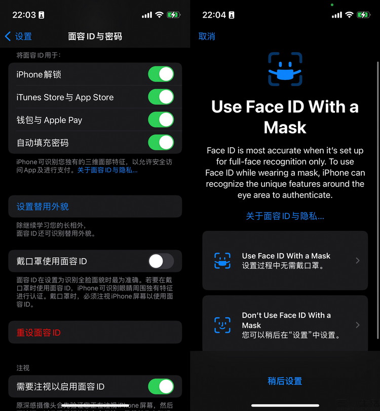 要使用這個功能,只需在系統設定的“面容ID與密碼”選項裡,勾選“戴口罩使用面容ID”即可。為了加強戴上口罩後解鎖的精準度,還可以在這之後重新錄入一到兩次面容ID。