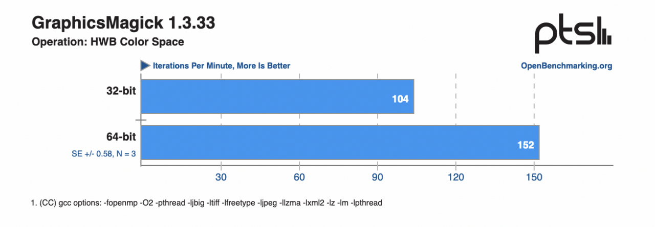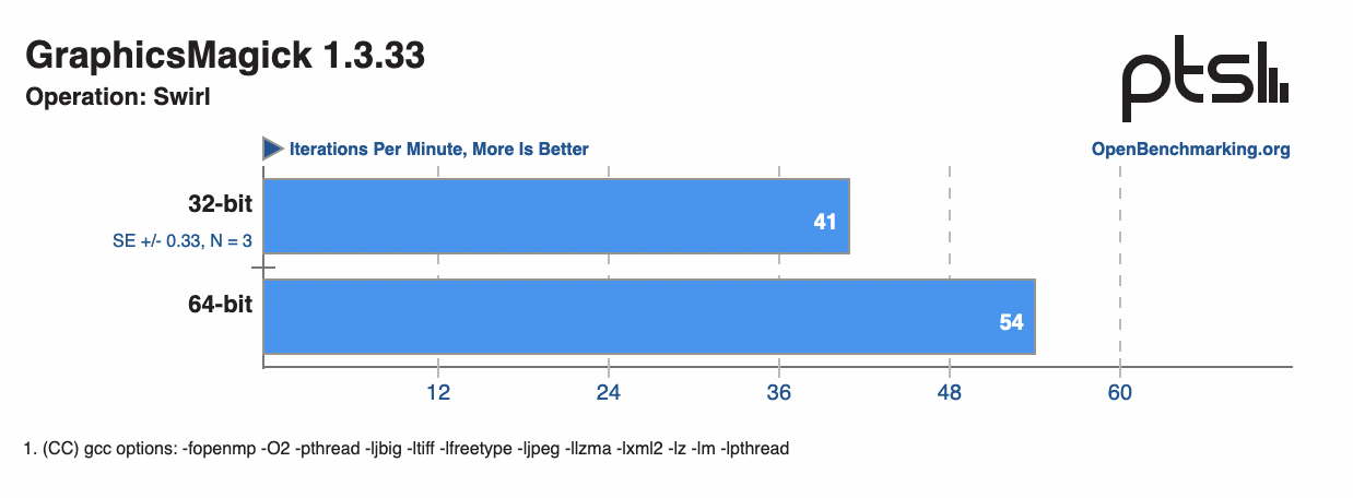 在接下來的 GraphicsMagick 測試中(分數越高越高,對 GraphicsMagick 及其 OpenMP 實現的測試),32 位和 64 位的測試成績就有了比較明顯的差別,其中在進行 HWB 色彩空間測試時兩者差距最大,64 位相比 32 位快了約 47%,而在進行 Swirl 操作時也有約 32% 的效能差距。除此之外,在進行旋轉、銳化和高斯噪聲處理時,也有 17% — 28% 左右的效能差距。