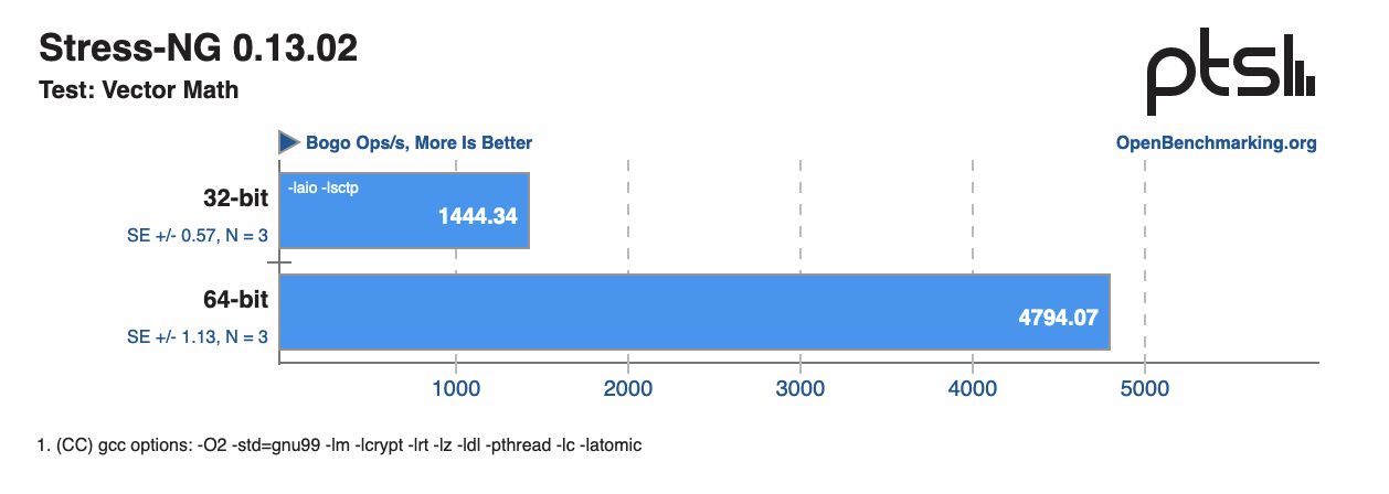 在前面的測試中也能看出,64 位相比 32 位在某些測試場景下有了 40% 以上的效能提升,而在 Stress-NG 測試中(分數越高越好,Stress-NG 是 Linux 壓力測試工具,可以對 CPU、Memory、IO、磁碟進行測試),兩者的效能差距更是進一步被放大,其中在 Vector Math 中 64 位的效能提升幅度達到了約 232%;在 Glibc C String Functions 測試中,也提升了約 196%。