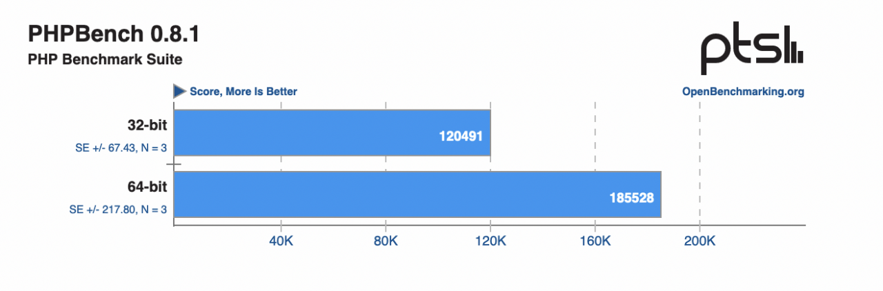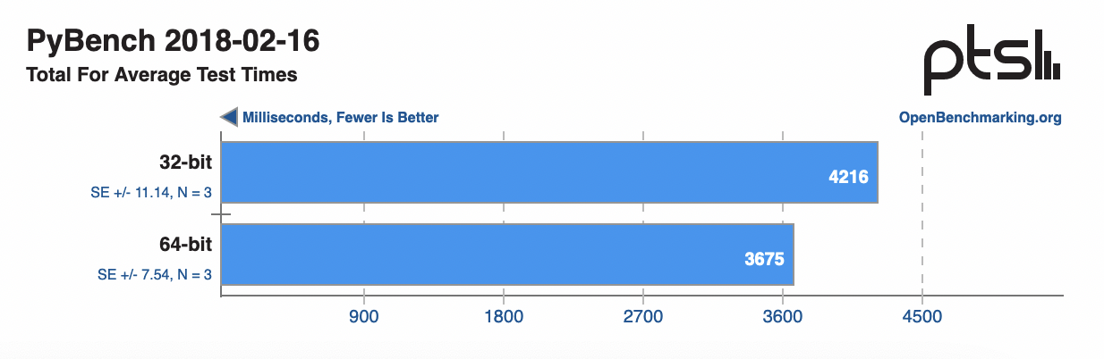除了多媒體編碼和系統的壓力測試以外,也專門對 Python 和 PHP 的效能進行了測試。其中在 PyBench 測試中(分數越低越好,PyBench 報告了不同函式的平均測試時間,提供了對 Python 在系統上的平均效能的估計),64 位相比 32 位提升了約 13%;而在 PHPBench 測試中(分數越高越好,PHPBench 執行大量測試,以便對 PHP 直譯器的各個方面進行評估),64 位效能則是提升了約 54%。