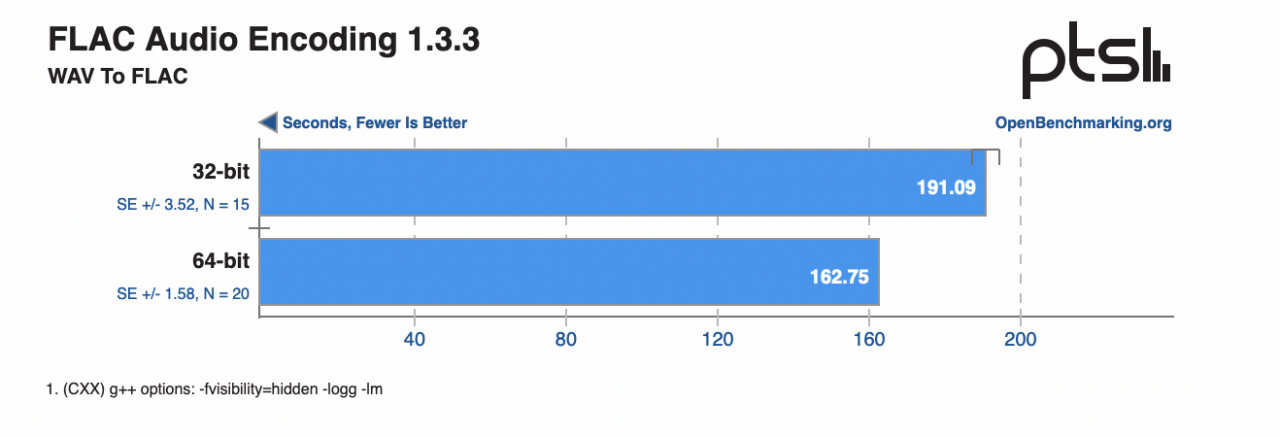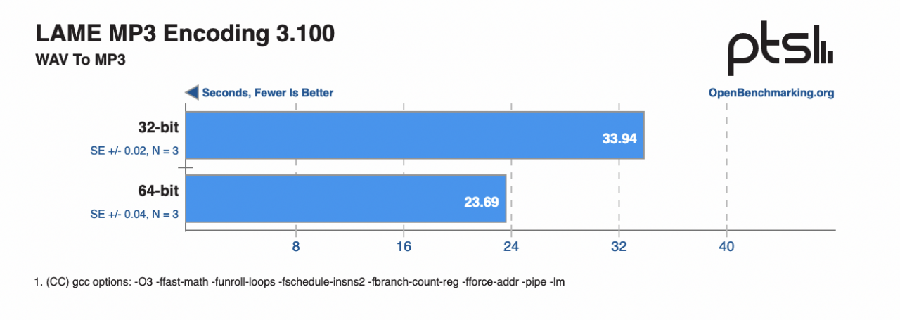 在 FLAC 音訊編碼測試中(分數越低越好,計算示例 WAV 檔案編碼為 FLAC 格式所需的時間),64 位比 32 位也提升了約 17%;LAME MP3 編碼測試中(分數越低越好,計算將 WAV 檔案編碼為 MP3 格式所需的時間),64 位提升了約 43%。