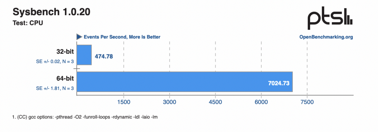 在 Sysbench 測試中(分數越高越好,Sysbench 是一個基於 LuaJIT 的多執行緒基準測試工具,專門測試 CPU 和記憶體),64 位處理器 + 64 位作業系統的優勢被最大化,64 位的效能提升幅度達到了驚人的 1380%。