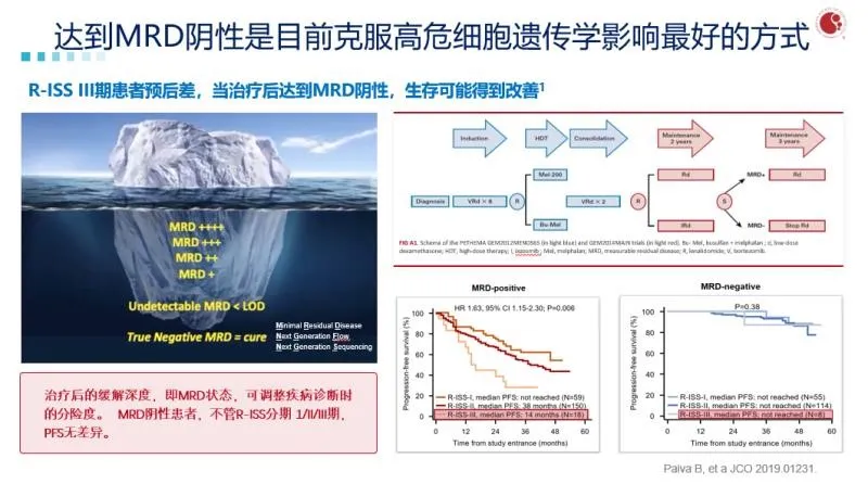 因此,治療具有高危特徵MM患者的關鍵,在於儘可能使用基於新型藥物的聯合方案,最好持續治療;卡非佐米為基礎方案可以使高危MM獲益;儘可能使MM患者達到MRD陰性並保持一段時間。