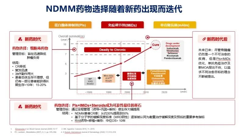 在藥物選擇上,現在大多選擇細胞毒藥物,旨在迅速降低腫瘤負荷。這樣做的結果有CR率低、復發迅速、副作用大、患者總體生存不理想。現在,Pls+IMiDs+Steroids成為可及性最佳的基石。誘導、鞏固、維持等全程管理,可以使患者生存大幅提高。選擇這樣的藥物聯合,NDMM患者CR率從約30%提高到50%,基於分子學的緩解深度標準(MRD陰性)逐漸被認同為衡量治療緩解深度及預後的重要參考指標。