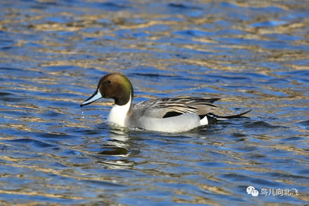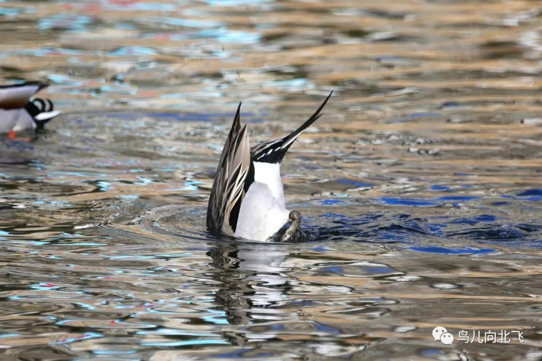 鳥之美,是固有的,是天賦的。雄鴨美於雌鴨,是雌鴨審美選擇的結果。鳥之樂,是後天的,樂否,取決於環境,甚至取決於人。嚴寒缺吃未必樂,人過度接近和干預,也必定不樂。上面看到3人為拍而過於接近羅紋鴨,它們只能一飛了之,即是不樂。針尾鴨一條特別引人注意的尾羽,像晚清遺老的那條小辮,作為一個標誌而存在,是物種特徵。巧克力色的頭飾,潔白的前胸,及其向上延伸於頸部兩側的一道白線,很像京劇臉譜的區域性。臉繪之美,未必不是模仿了野鴨。