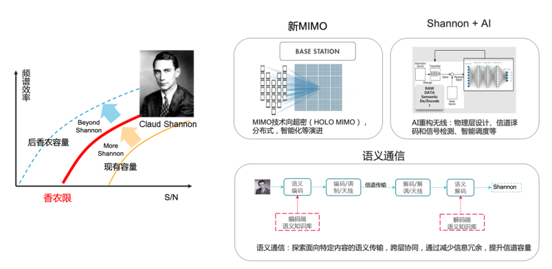 夏農公式我們在《誰是5G的主宰》一文有詳細解釋。這裡只給出結論:提高信噪比,增加頻寬。此外所有的工程師們別無選擇。可數字文明已經到來,資訊量太大,夏農定理已接近極限。怎麼辦?華為正在探索新一代MIMO和無線AI等理論與技術,研究語義通訊等新理論嘗試超越夏農極限,為通訊開啟更為廣闊的發展空間。