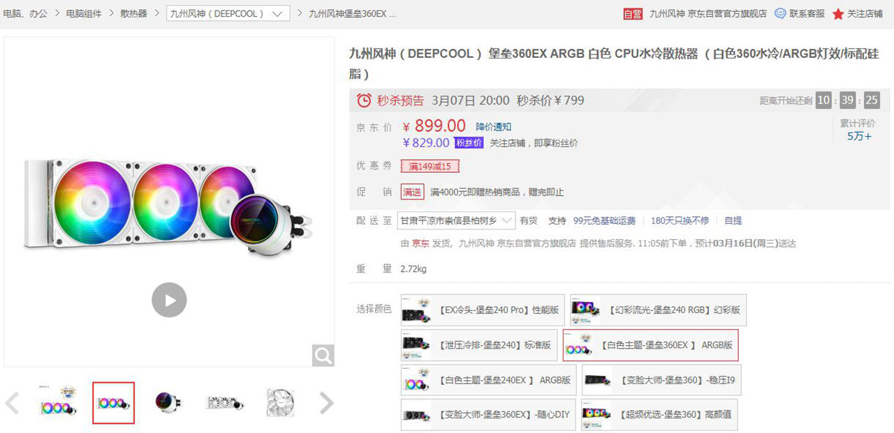 散熱器選擇了九州風神 堡壘360EX ARGB 白色,該散熱器做工紮實,效能強悍,配色也符合吹雪主機板的氣質,近期799的秒殺價也非常給力,有需要的網友可以考慮一下。