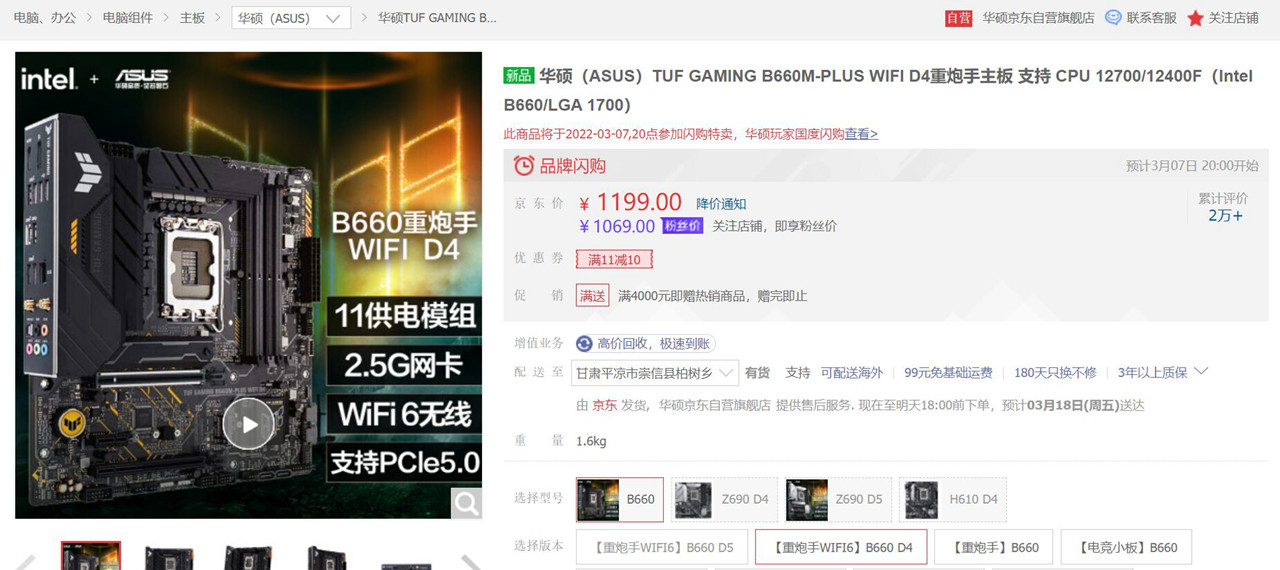 主機板方面,華碩TUF GAMING B660M-PLUS WIFI D4重炮手不僅做工用料非常紮實的,功能也很豐富,如採用11供電模組、PCIe 5.0顯示卡插槽、雙M.2介面、2.5Gb網絡卡、WiFI6無線網絡卡、雙向AI降噪等。另外,由於該主機板的供電非常強悍,預算充足的玩家也可以上更高階的CPU,本人實測該主機板搭配i7 12700K(F)級別的CPU都是毫無壓力的。