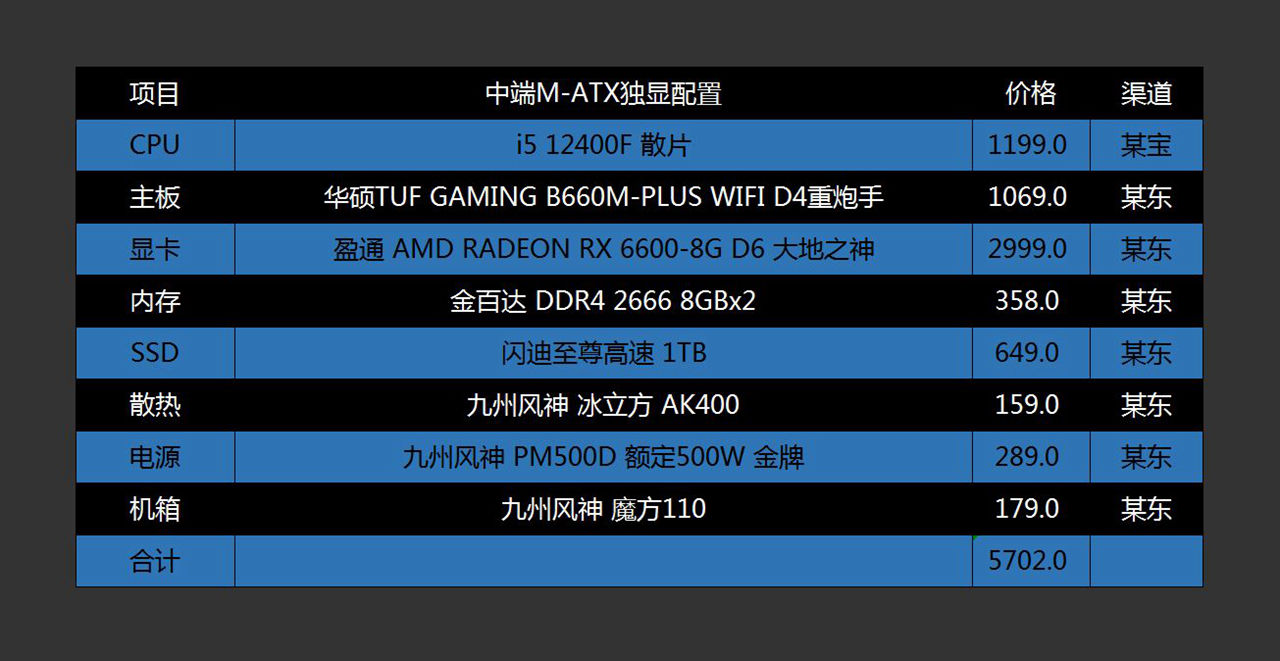 要想得到更好的遊戲體驗,自然得上獨顯,只不過現在的入門級顯示卡確實有點坑,所以我這套配置直接跳過了入門級顯示卡,選擇了中端的RX6600顯示卡。U板方面,選擇了最近新出的i5 12400F+B660組合,根據網上的評測來看,i5 12400F的遊戲效能還是很能打的。
