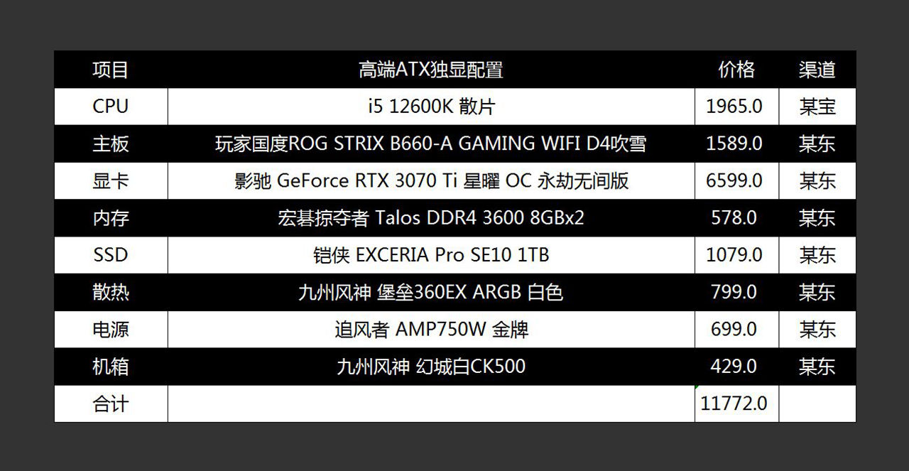 另外,如果只是打遊戲的話,i5 12600K和i7 12700K及i9 12900K的差距並不是很大(尤其是2K、4K等高解析度下),既然如此,咱們本著追求高性價比的原則,採用了i5 12600K+B660+RTX3070Ti的組合,這樣一來,可以把U和板省出來的錢放到顯示卡上,遊戲體驗反而會更好一些。