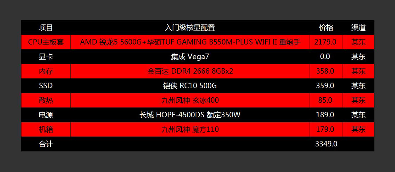 CPU和主機板選擇了AMD 銳龍5 5600G+華碩TUF GAMING B550M-PLUS WIFI II 重炮手套裝組合,目前這套套裝標價2279,用券後2179,價效比還是比較高的。