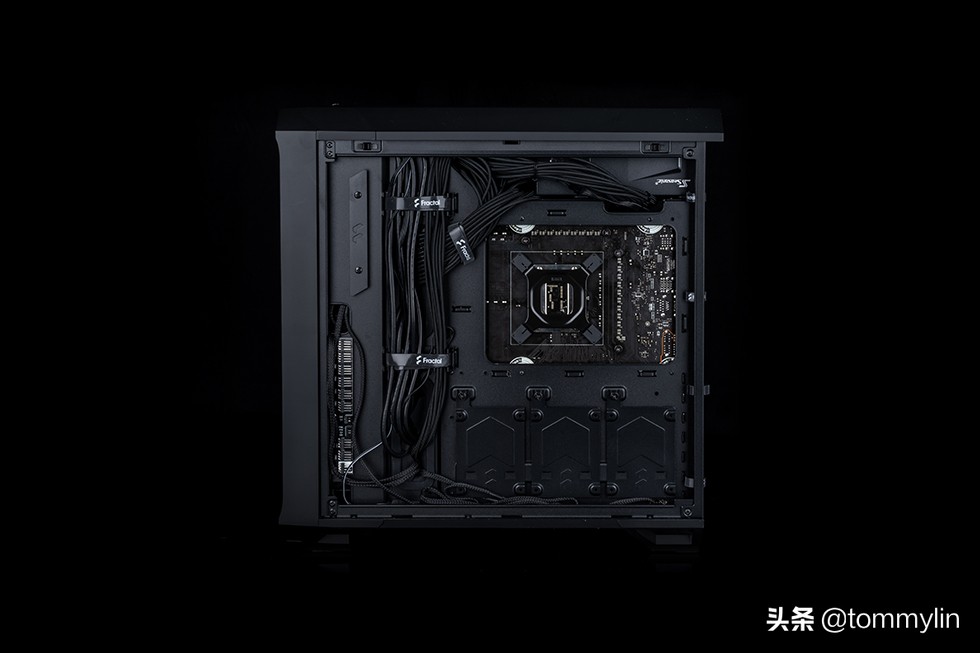 ▲ 從背板可以看到內框的主機板安裝位預留了大面積的開孔,極大程度方便了安裝過程並提高了主機板的散熱效能,同時在背板和尾部邊緣都預留了用於離線的紮帶,細節部分做的十分到位