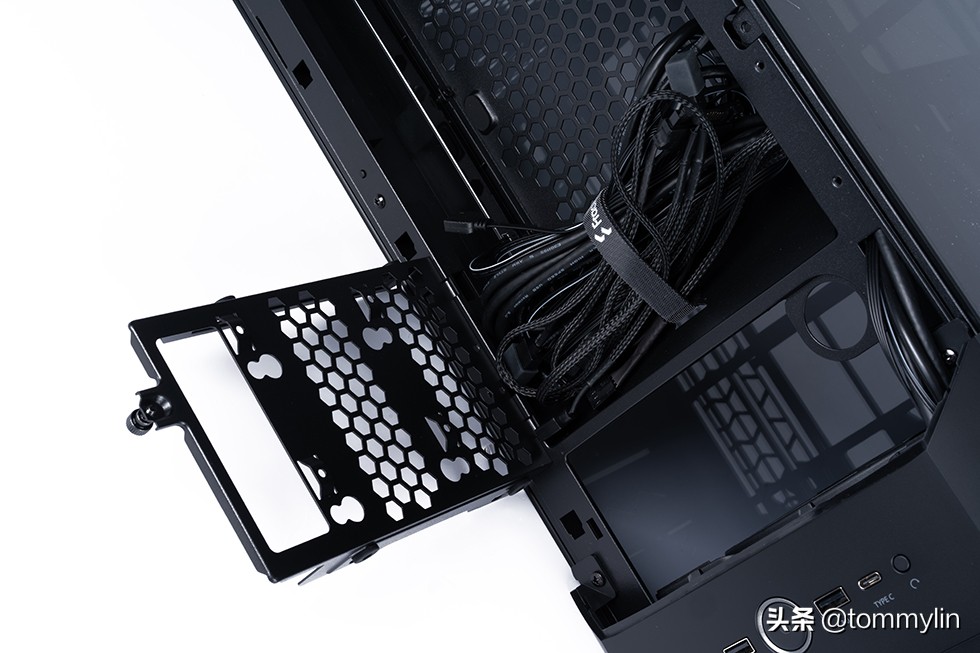 ▲ 開啟頂蓋可以看到上方的佈局,存放了一個小配件盒,內部為機箱螺絲配件。電源上置設計,支援210mm長度電源,同時帶有一個獨立可拆卸的硬碟安裝支架,支援3.5寸或2.5寸硬碟安裝,下方為各種機箱內部線材,大部分均有包網處理,帶有尼龍搭扣的理線器,便於電纜安裝管理,細節部分還是相當到位的。同時可以看到在頂部預留了安裝分體水冷時可以利用的注水口