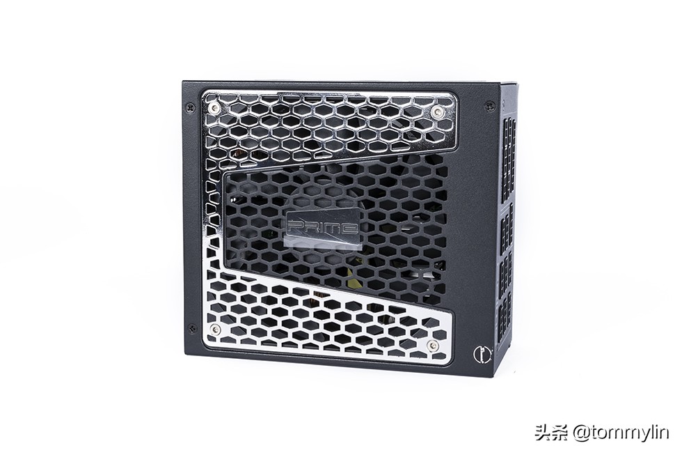 ▲ 電源尺寸為170mm*150mm*86mm,正面由一個亮銀色的凹字金屬網格和一個黑色凸字金屬網格鑲嵌而成,中間是PRIME銀色金屬標識。配備了一個直徑為135mm的FDB液壓動態軸承風扇,可以根據需要最多可以支援停轉、低轉速和高轉速3種狀態