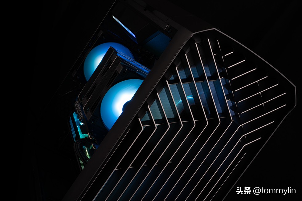 首先是用通電下的效果,光效方面選擇了藍色和青綠色的loop,透過前臉格柵2個180mm RGB風扇帶來的燈效還是相當炫酷的