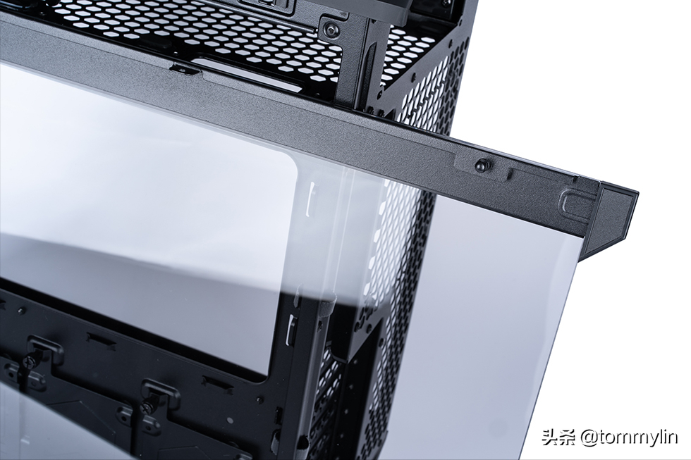 ▲ 無縫鋼化玻璃側板,上下兩邊都用了鋼條加固,採用碰珠設計加上凸出的小扣邊,使得面板的開關十分便捷