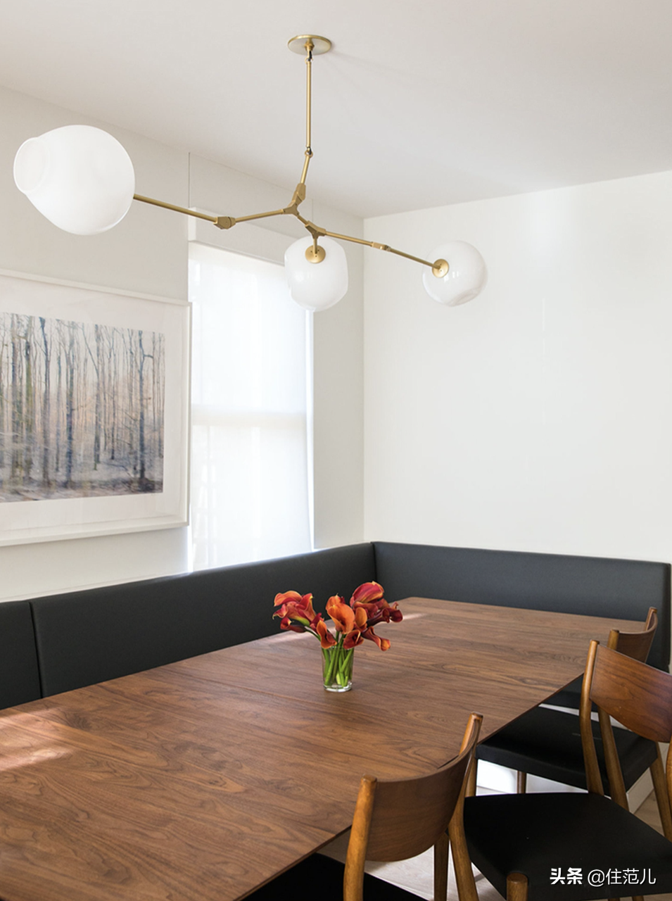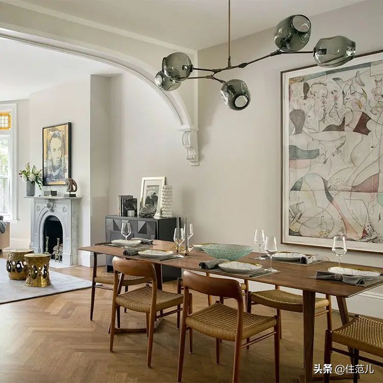 餐吊的關鍵詞是“低、低、低”,如果有人覺得客廳吊燈太低容易撞頭,那我強烈建議把餐廳燈吊低,高度以人坐下後不擋住對面人的頭為最低標準。
